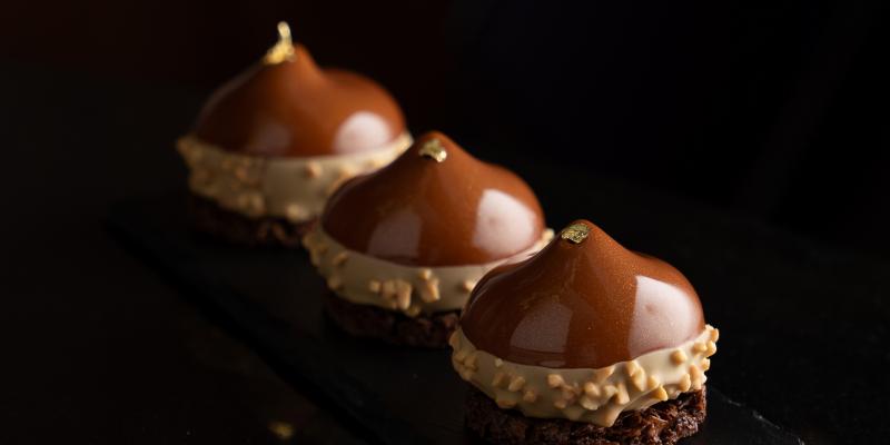 Mus z serka mascarpone, cremeux espresso, cremeux z karmelowej czekolady i kawowe ciastko podane na karmelizowanym spodzie.
