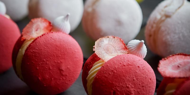 Jabłka z pigwą i trawą żubrową zamknięte w kuli musu z białej czekolady podane na kruchym spodzie