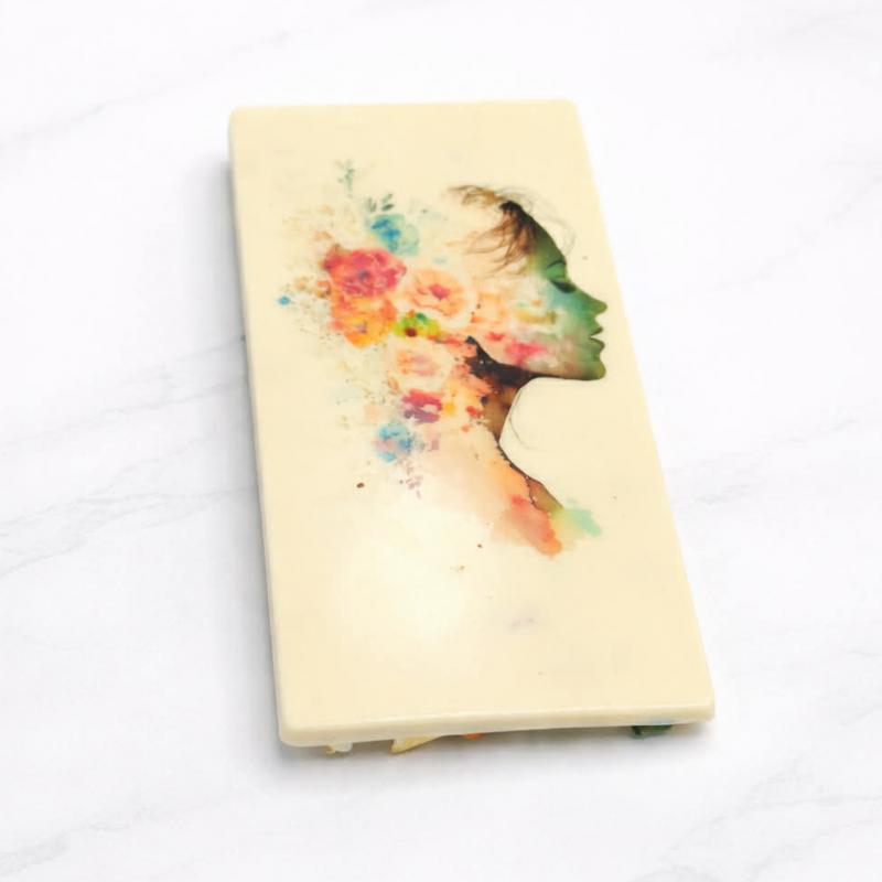 Tabliczka czekolady odlewana z najwyższej jakości białej czekolady. Na tabliczce naniesiony wzór - idealny prezent na Dzień Kobiet