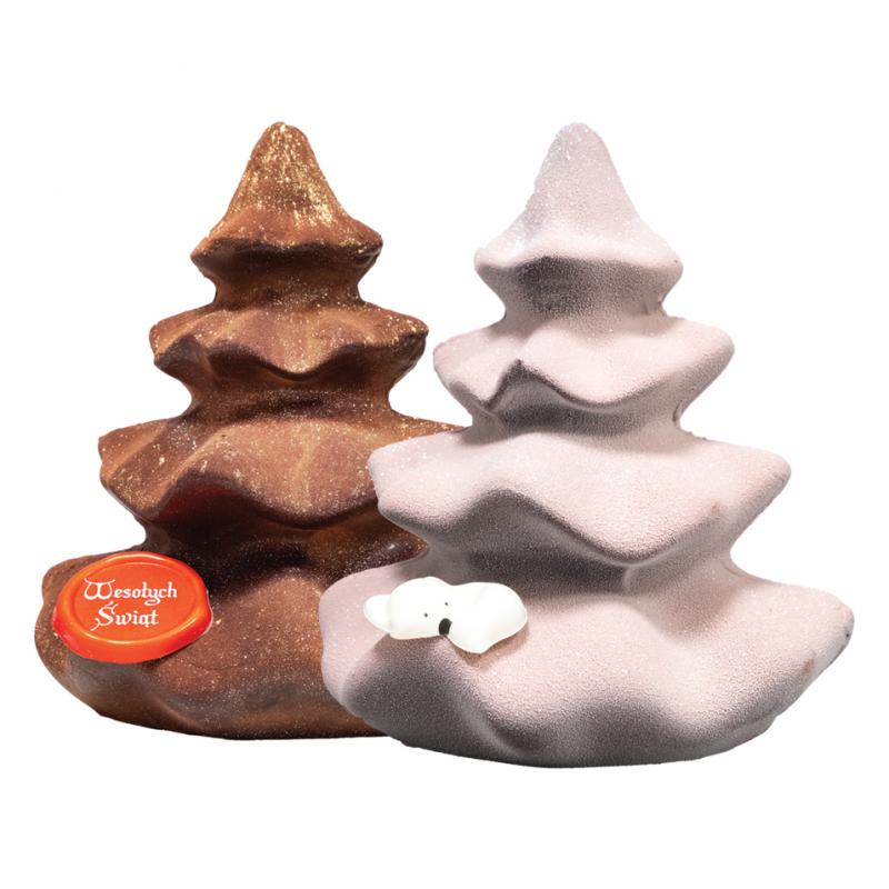 Choinka z najwyższej jakości ciemnej czekolady, zdobienie w formie dekorowanego zamszu według wariantów.